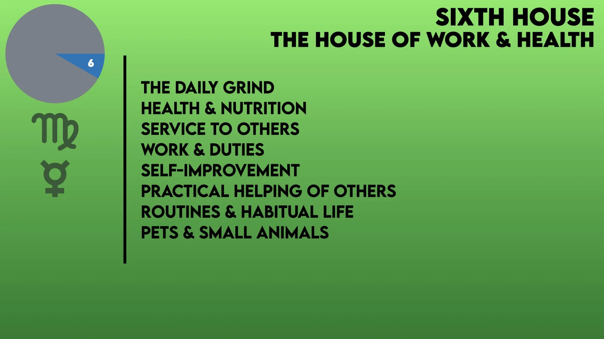 In the sixth House of Work & Health the daily grind is in focus. Life’s responsibilities, duties, routines and habits are here. So is service to others, health (physical and mental), healthcare, nutrition, self-improvement, small animals and pets. The Sign and any Planets in this house bring their energy to these areas.