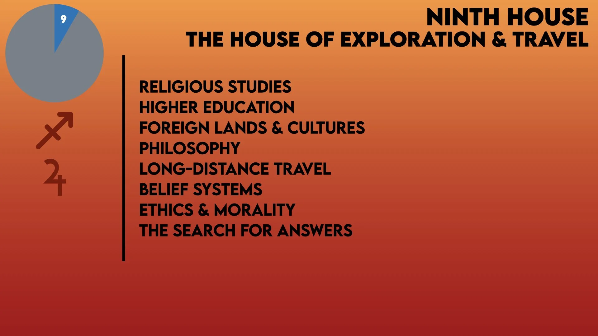 The ninth House of Exploration & Travel is where we find experiences such as higher education, religion, philosophy, long-distance travel, and foreign lands and cultures. It is closely tied to the search for answers and an expansion of understanding. It's where we search for truth. Also found here are ethics, morality, belief systems, and faith. The Sign and any Planets in this house bring their energy to these areas.