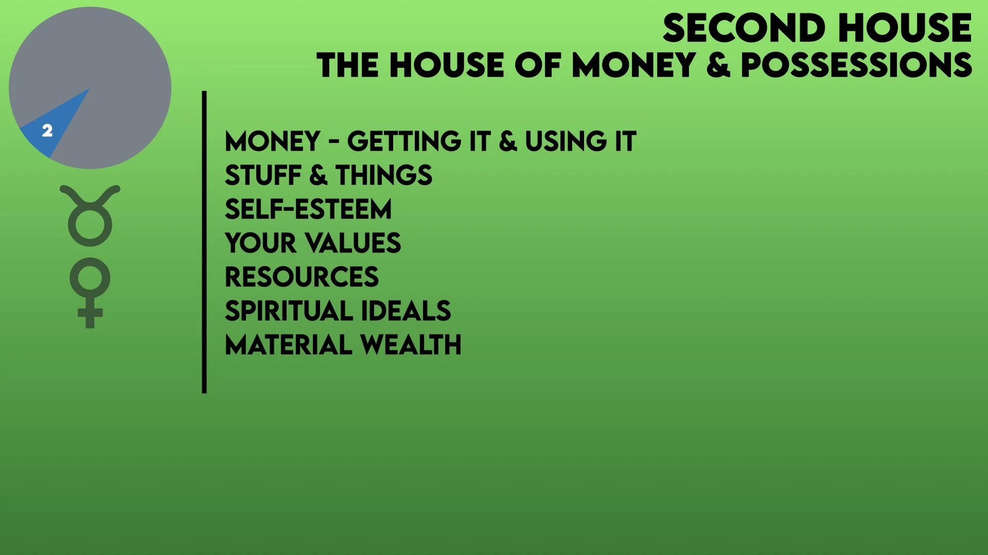 The second house is the House of Money & Possessions. It defines areas of life such as how you acquire, and use, money, what you value, material possessions, and your sense of self-esteem. The Sign and any Planets in this house bring their energy to these areas of life.