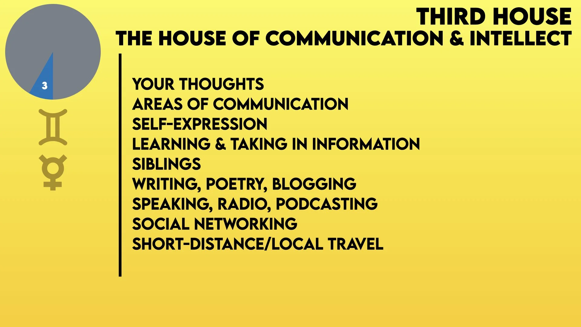 The third House of Intellect & Communication covers our thinking, learning, data gathering, observation, and the expression of our intellect. Communicative activities like writing, poetry, blogging, podcasting, and journalism are also contained in this house, as well as siblings and short-distance travel (road trips and such). The Sign and any Planets in this house bring their energy to these areas.