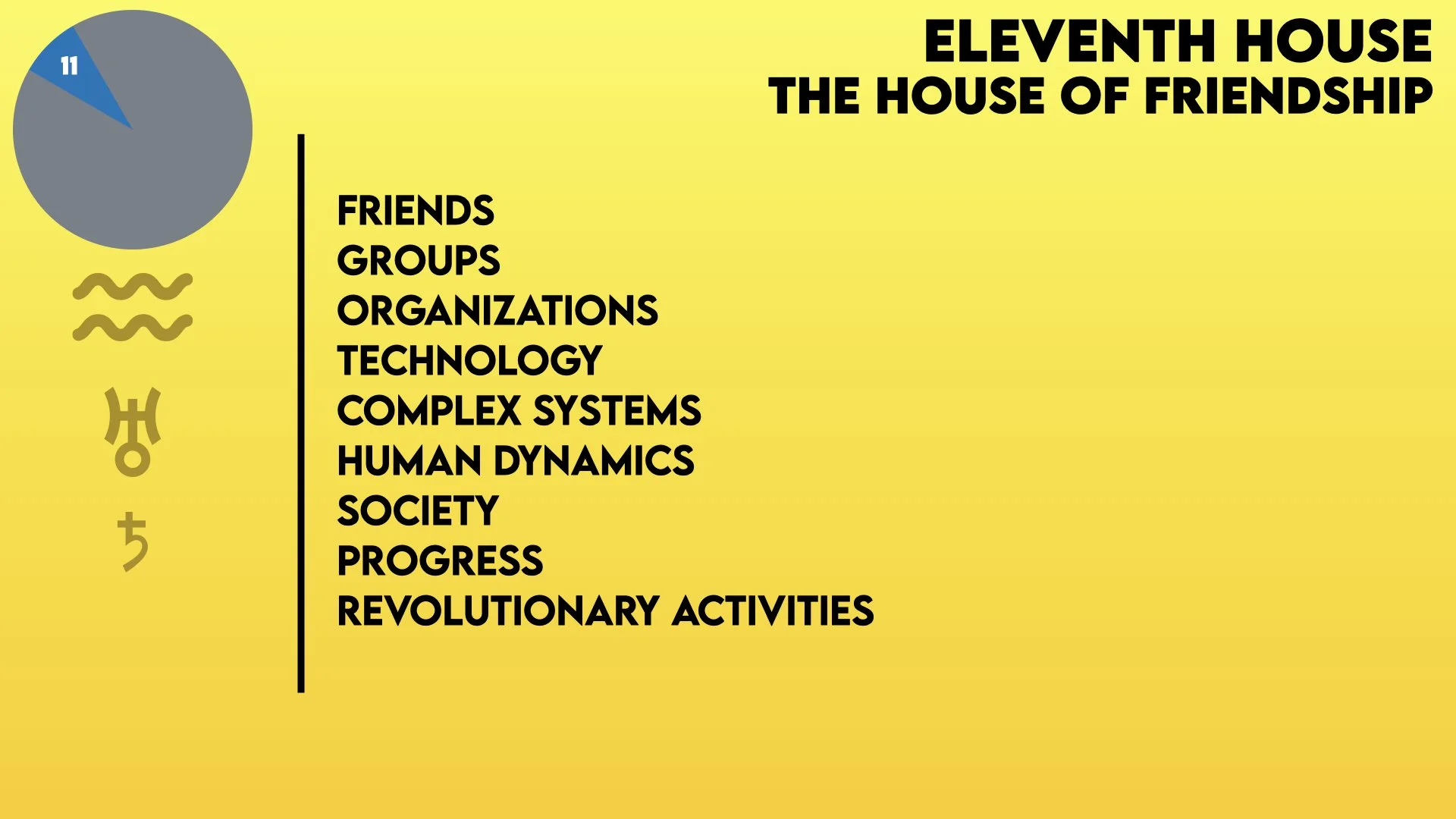 What would life be without friends? And here in the eleventh house we find friends as well as groups. In addition, defined by this house is technology, societal progress, complex systems, human dynamics, and revolutionary activities. The Sign and any Planets in this house bring their energy to these areas.