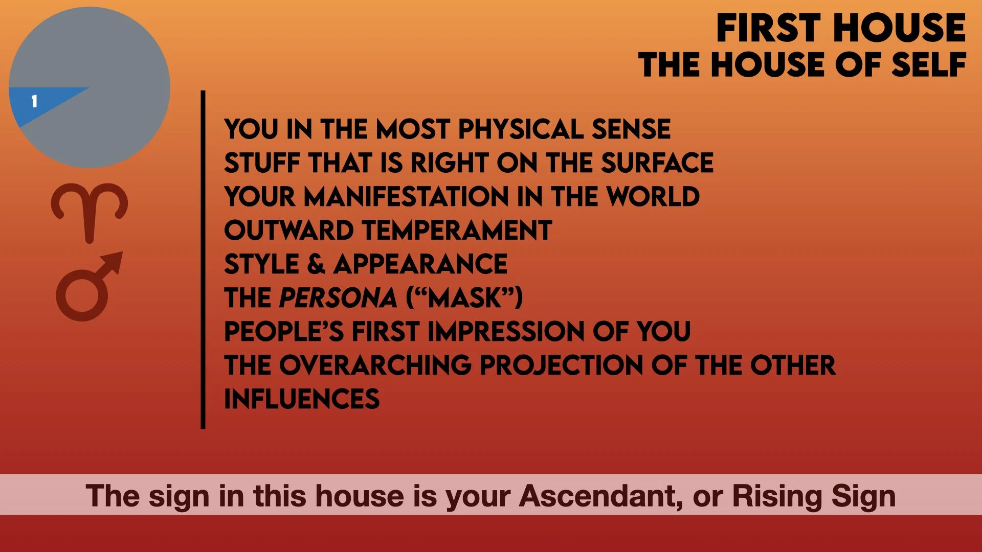 The first house is known as the House of Self. This is a very important house as it defines you in the most physical sense. The sign that the cusp of this house is in determines your Rising Sign, also known as the Ascendant. The first house is about how you are in the world, the first impression people have of you, the way you come off in the most physical sense. This house defines your persona, the role you play on the stage that is the world. Planets here bring their energy right to the forefront. You can read more about the Rising Sign here.