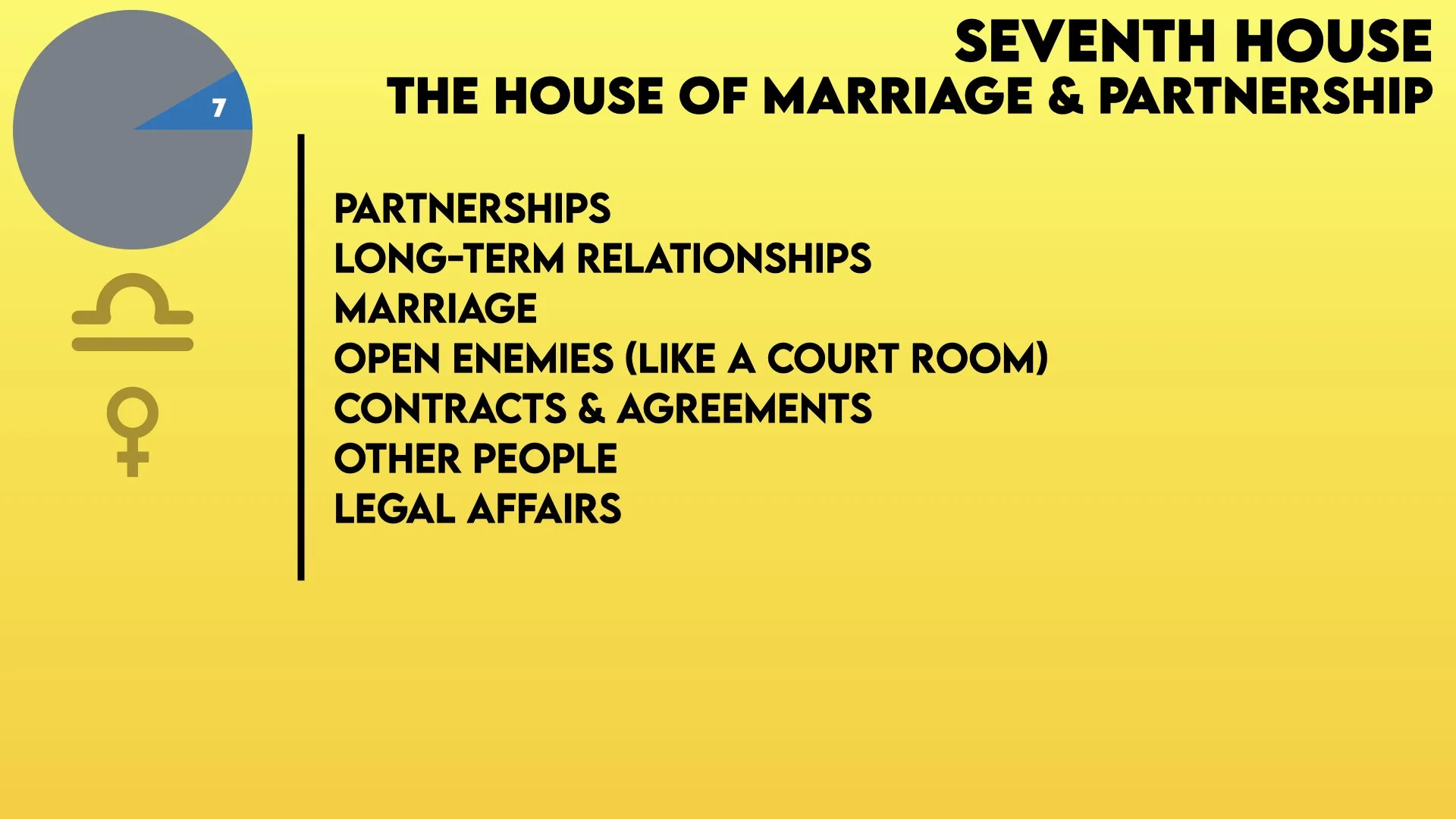 In the House of Marriage & Partnership, the arena of relationships is involved. Here, we find marriage, long-term partnerships - both business and personal - legal affairs, contracts, agreements, and the enemies you fight out in the open (like a courtroom). The Sign and any Planets in this house bring their energy to these areas.