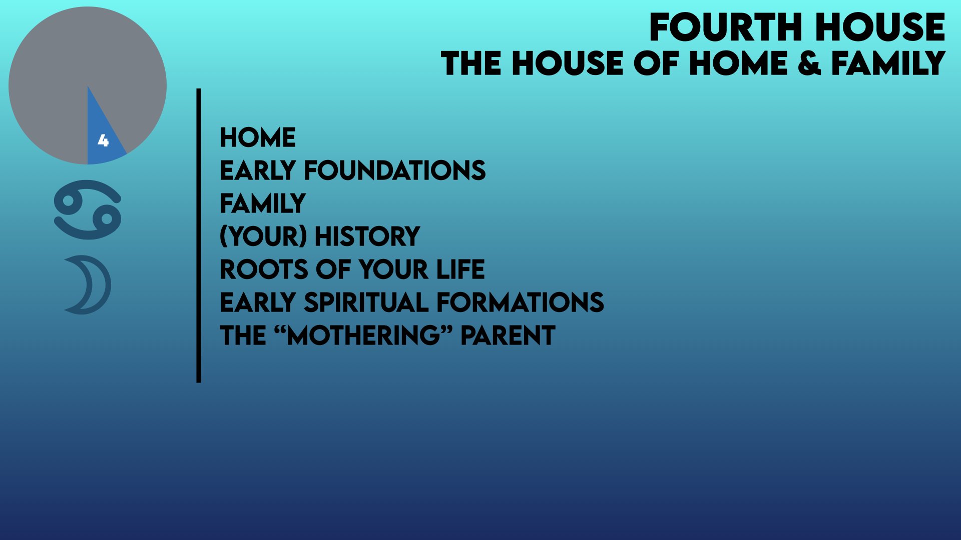 In the House of Home & Family, your early foundations are in view. It defines areas of life such as early life experiences, your home life, the family dynamic, spiritual foundations, and traditions. Some also believe this house represents the latter third of your life. The Sign and any Planets in this house bring their energy to these areas.