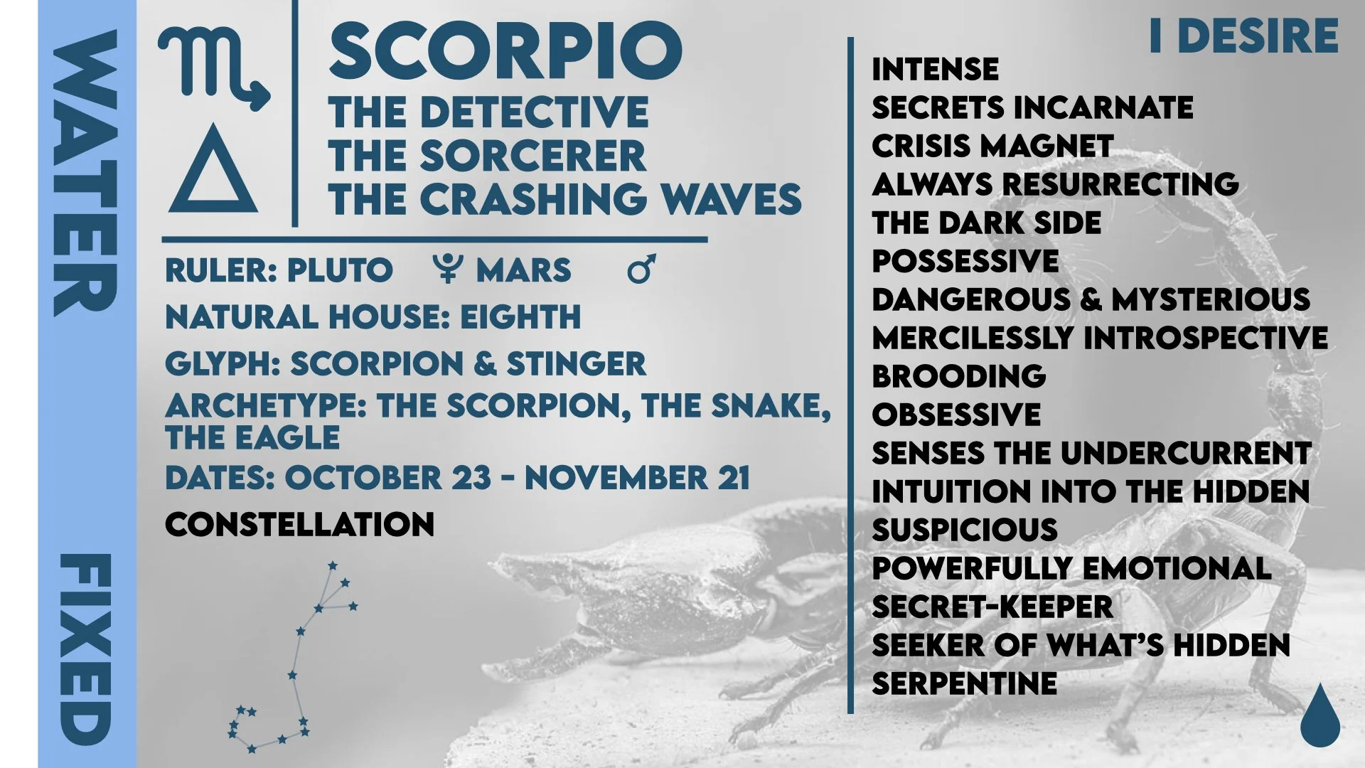 Glyph: Likely an Alchemical symbol stylized with an arrow - possibly more in reference to Mars, its classical ruler, than a scorpion stinger